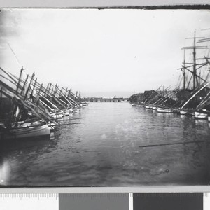 Two rows of sailboats and sailing ships docked across a waterway from each other in Vallejo Yacht Harbor. Title and date transcribed from envelope. Copy print of original. Duplicates of this image appear in several of London's photograph albums.