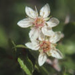 Close-up of white petals and a pink and yellow center of the shrub's flowers.