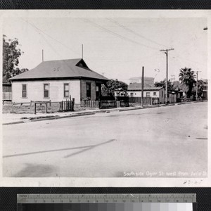 View of houses on Ogier Street near Old Chinatown in Los Angeles, with the Los Angeles Hall of Justice in the background. Title transcribed from photograph.