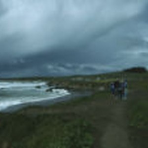 People walk along the cliffs overlooking the seashore with dark storm clouds above.
