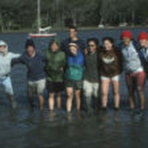 Group of students pose for picture on the seashore with sailboats and tress in background.