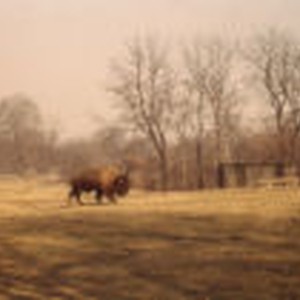 A bison standing in a caged exhibit at The Bronx Zoo with trees in the background.
