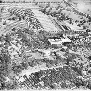 The Huntington residence and library building are visibly, as well as the rose garden and arbor. The label that accompanies this photo in the album reads "No. 111 Aerial photo of north section of the estate, about 1921." Numerous MS notes on the verso, including "Spence Air Photos, 2404 West Seventh St., Fitzroy 2948, Los Angeles, Calif."