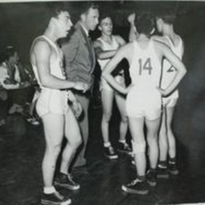 Photo--black and white: Analy High School Tigers basketball 1949. Coach Walt Foster with ball players during game. Kimura, George (14) Perry, Ron (21) Gorlick, Gene (15).