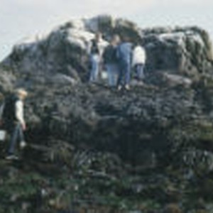 One student climbs the kelp covered rocks while a group of students stand, and talk, at the base of a large rock.