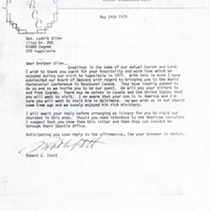 A letter by Robert C. Stott to Ludvik Üllen thanking him for his hospitality during his stay in Croatia and extending him an invitation to the World Pentecostal Conference in Canada. [Description English/roman)] Pismo Roberta C. Stotta Ludviku Üllenu u kojemu mu zahvaljuje na gostoprimstvu tijekom njegovog boravka u Hrvatskoj te mu izražava poziv na svjetsku pentekostalnu konferenciju u Kanadi. [Description (original non-English/roman language/script)]