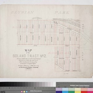Being a subdivision of Lots 6, 7 and the East half of Lot 5, Block 46, and Lot 2, Block 45, Hancock's Survey of Donation Lots, along Effie St. south of Elysian Park, from Bishop to Solano Ave., Yorktown to Sampson St.. Pink & black ink, pencil notations, calculations; shows vegetation adjacent to Elysian Park to the north. Alt title supplied by cataloger.