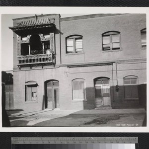 View of attached two-story brick buildings on Napier Street in Old Chinatown, Los Angeles, one with balcony, plants, and lighting. Title transcribed from photograph.