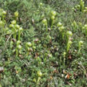 Cluster of California pitcherplants growing amongst tall grass and other foliage.