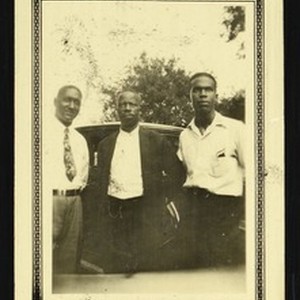 Photograph of Bishop Charles Harrison Mason (middle) and Bob Mason (right) with an unidentified man, Page Normal School, Hearne, Texas, [s.d.]. [Description English/roman)]