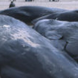 A whale with footprints on its side and a large dorsal fin lying next to other beached whales.