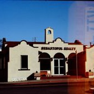 Slides, Kodachrome color transparency; The Sebastopol Realty building at the corner of Bodega (Highway 12) and Petaluma Avenue in Sebastopol, February, 1976. This mission-revival style building was built in 1923 and was originally the home of Sebastopol