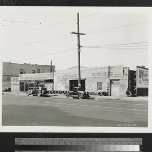 View of Aliso Auto Wreckers & Parts Co. on Aliso Street near Old Chinatown, Los Angeles. Tires and rims are stacked along the front of building. Automobiles are parked in the street. Title transcribed from photograph.