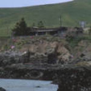 Rolling green hills serve as a backdrop to a house overlooking the rugged coastline at Cayucos.