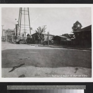 View of houses with fenced-in yards and trees on Bauchet Street near Old Chinatown in Los Angeles, with the Wilson & Co. plant in the background. Title transcribed from photograph.