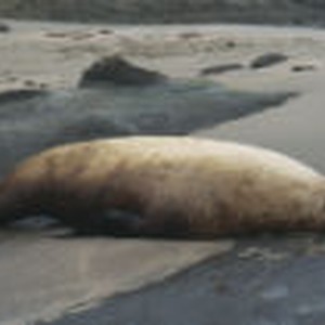 A dead sea lion lying on the beach.