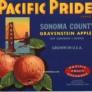 Photo--color: Pacific Pride brand Sonoma County Gravenstein Apple box label. Pacific Fruit Exchange.