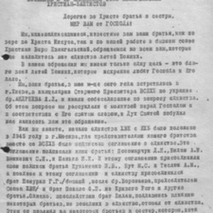 A letter-appeal, 1958 June 6, to non-registered communities of CFE (Christians of Faith Evangelical) from representatives of CFE who joined the union. [Description English/roman)] Письмо обращение, 06.06.1958 года, к не регистрированным общинам ХВЕ (Христиан Веры евангельской) от представителей ХВЕ вошедших в объединение. [Description (original non-English/roman language/script)]