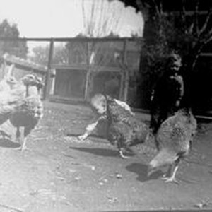 Photo--black and white, from Borba 8" x 10" celluloid negative: Two young children in penned chicken yard among chickens. Circa 1930s
