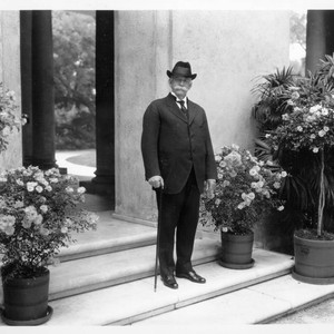 Full-length portrait of Huntington dressed in a black suit with black tie and hat and a cane in his right hand. Potted plants are on the steps on either side of him.