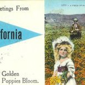 Postcard--color print: Greeting card. California theme postcard. Field of California poppies in bloom with four people. Handwritten message on back. Postmarked Sebastopol, Oct. 1913.