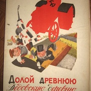 A poster. Caption reads, "Doloi drevniuiu dedovskuiu derevniu / Долой древнюю дедовскую деревню", meaning, "Let's get rid of the old country life style set by our grandfathers". [Description English/roman)]
