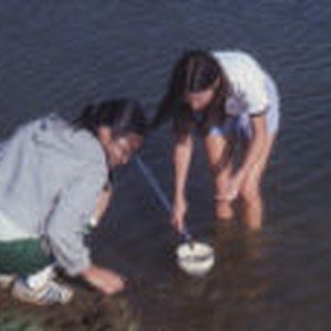 Two girls. one of which is Rhoda Au, conducting a lake lab.