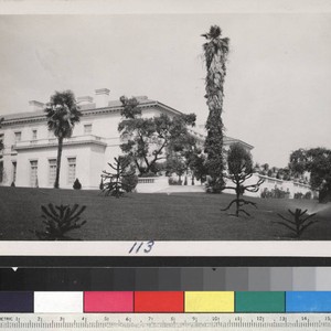 View of the south terrace and west façade. Urns line the south terrace and some plants have been installed on the lawn. The label that accompanies this photo in the album reads "No. 113 Residence - southwest exposure, about 1912."