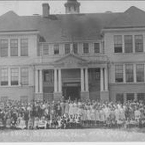 Photo--black and white of postcard: The New Sebastopol Grammar School with large number of students standing in front of the building. Hand written at the bottom of the postcard "Grammar School Sebastopol, Calif, May 2nd, 1910. Verso has handwritten identification. Background: Originally built in 1895 without the 2nd story, which was added prior to 1910. By 1912 the enrollment was at 348 pupils.