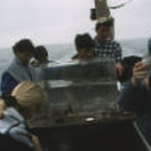 Students studying aquarium filled with sea life aboard a boat in the ocean.
