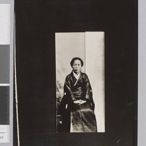 Portrait of Yoshimatsu Nakata's (Jack London's onetime valet) mother wearing traditional Japanese kimono. Title and date devised by cataloger. Copy print of original. Verso of photo reads: "Nakata's Mother."