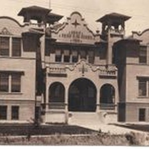 Photo--sepia: Analy Union High School, two story brick building with additional basement classrooms in 1909. The school was built in 1908 with three observation towers or bell towers. Photographed by William S. Borba.