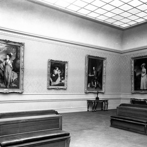 The portraits on the walls, from left to right: Sir Joshua Reynolds' Jane Fleming, later Countess of Harrington (1778-1779); Reynolds' Lavinia (Bingham), Countess Spencer, and John Charles Spencer, Viscount Althorp, later Earl Spencer (1783-1784); Thomas Gainsborough's Karl Friedrich Abel (circa 1777); George Romney's Penelope (Rycroft) Lee Acton (1791). Stamp on verso reads "Hiller Studio, 336 So. Hudson, TE. 6904 Pasadena."