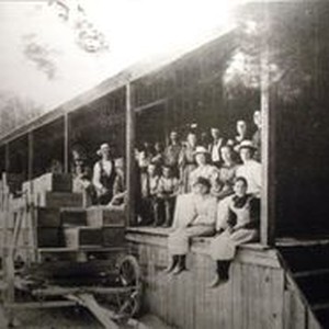 Photo--Black and white, mounted: An unidentified apple processing building with men, women and children workers on the loading dock. An unhitched wagon sits by the loading dock with a load of apple boxes. Circa 1900s.