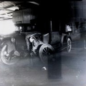 Photo--black and white, from Borba 8" x 10" celluloid negative: Two vintage 1920s cars in a repair shop. The car in front has visible front end damage. A sign in the rear is for "Diamond Tires"