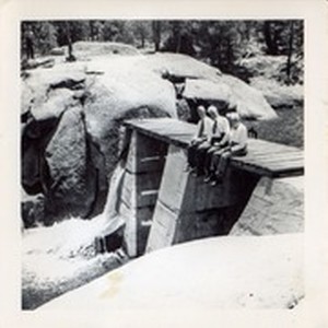William P. Whitsett and two unidentified men sitting on dam which forms Lake Ida at Camp Whitsett.