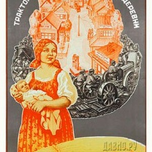 A poster dedicated to a new lifestyle of the soviet collective farmers. Caption on top reads, "Traktory i iasli -- dvigateli novoi derevni / Тракторы и ясли — двигатели новой деревни", meaning, "Tractors and nurseries for infants are forces moving forward the new country life". Caption at the bottom reads, "Ne zabyvaite o rodil'noi pomoshchi i konsul'tatsiiakh v kolkhozakh i sovkhozakh / Не забывайте о родильной помощи и консультациях в колхозах и совхозах", meaning, "Remember about maternity services in kolkhozes and sovkhozes (two types of soviet collective farms)". [Description English/roman)]