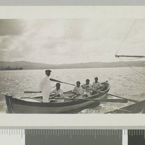 Ship captain stands in a skiff with four oarsmen rowing in water. Another boat's sail is partially visable.