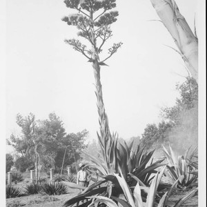 A person stands behind an agave plant which has branched and flowered on a very tall inflorescence . The label that accompanies this photo in the album reads "Agave atrovirens, IB-74."