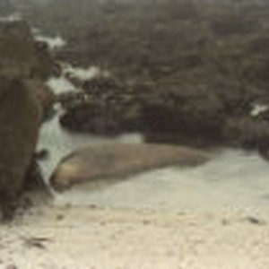 A six year old male seal is lying in shallow water on Shell Island.
