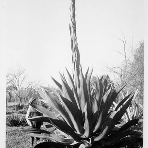 A person standing next to a tall agave plant, with inflorescence (flower stem) three times the height of the man. The label that accompanies this photo in the album reads "Agave atrovirens, Z-93."