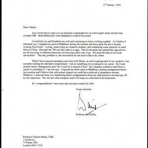 Letter of correspondence from Professor D.A. Kirby to Charles Handy congratulating Handy on his CBE, January 11, 2000; Charles Handy Papers; Box 13, Folder 15; 1 page