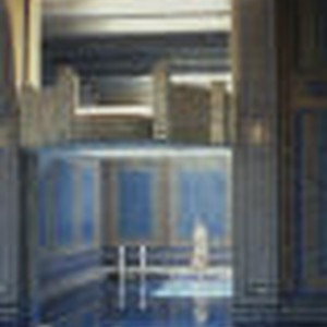Sunlight shines into the indoor pool at the Hearst Castle and highlights the ornate blue, and gold mosaic tile.