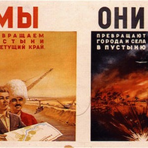 Soviet anti-imperialistic and anti-American poster. Captions read, "Мы превращаем пустыни в цветущий край. Они превращают города и села в в пустыню / My prevrashchaem pustyni v tsvetushchii krai. Oni pervrashchaiut goroda i sela v pustyniu", meaning, "We turn the desert into the flourishing land. They turn towns and villages into desert". [Description English/roman)]
