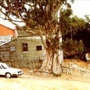 Slide, color transparency: Unidentified old house, fence and Eucalyptus tree. 1982