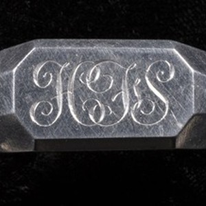 An aluminum ring belonging to Hiroshi Sugiyama, 1944. His initials are engraved on the head of the ring, "Wales 1944" and "England 1944" are engraved on either side, Sugiyama's name and military ID number are engraved on the inside band.