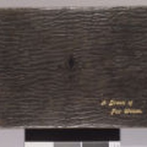 Album is bound in black, textured leather. A fleur de lis graphic element is embossed in the center of cover. The title, "A Dream of Fair Women," is embossed in gold lettering in the lower right corner of cover. The number "79" is affixed to the top of spine with glue. Album contains images collected by Charmian London, including clippings of artwork and a few photographs of nude women. Moderate wear over surface, with heavier wear at the edges where the spine meets the front and back covers. Pages 61 to 96 are blank.