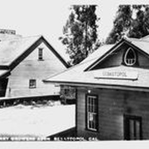 Photo--black and white: Sebastopol's Northwest Pacific train depot circa 1908 with its distinctive egg-shaped eave window. The Sebastopol Berry Growers Inc. building is to the left. The sign reads: "Sebastopol Berry Growers Inc. Berry chests baskets Hay grain and poultry supplies." Both are wood clapboard buildings.
