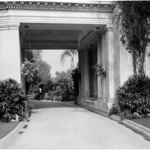 A view of the driveway and plants on the north side of the residence. MS notes on verso read "HEH residence: porte cochère" and "Art Gallery, Drive way." MS note on folder reads "HEH residence: south facade and terrace, loggia and port cochère c. 1920."