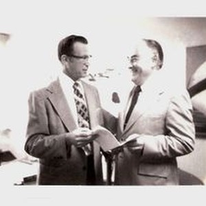 Photo, black and white : Don Harris, left, and Representative Don Clausen, c. 1970. Clausen visiting Palm Drive Hospital.